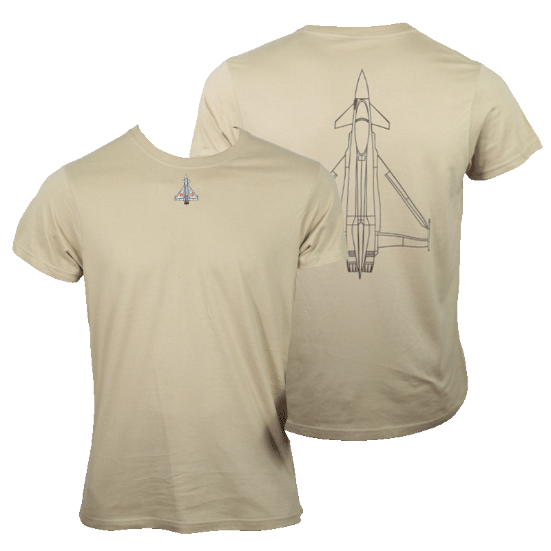 Camiseta de algodón arena con bordado frontal en el pecho del Eurofighter y gráfico técnico posterior de gran tamaño.