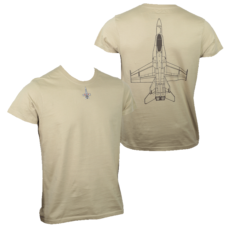 Camiseta de algodón color arena con bordado frontal en el pecho del avión de combate F-18 Hornet y gráfico técnico posterior a gran formato.