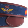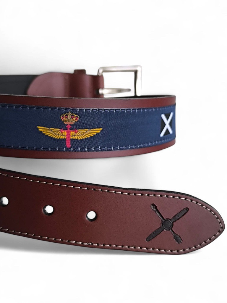Cinturón deportivo de cuero autentico «Alas Militares», con detalles bordados de las alas de la aviación militar española y de la Guardia Civil. Un accesorio exclusivo, que combina estilo y pasión por la aeronáutica. Ideal para amantes de la aviación y coleccionistas. Color: MARINO. Ancho de 35 mm.
