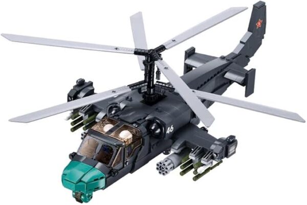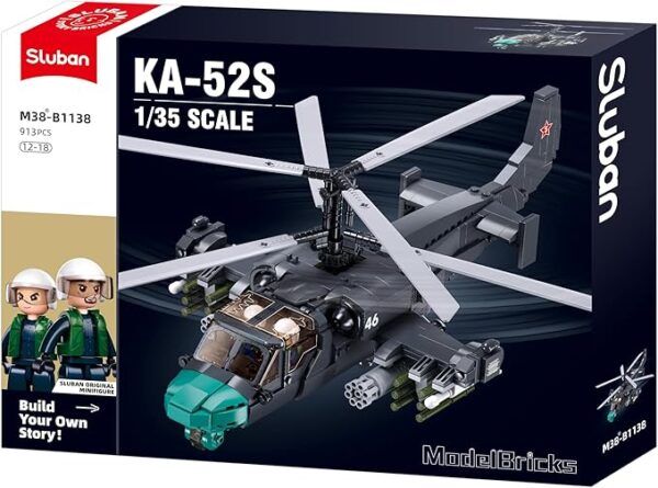 Kit a escala 1:35 del helicóptero de combate ruso Kamov Ka-52S de la colección Army Model Bricks. Las hélices opuestas están conectadas y giran una contra otra como en el modelo real. También se incluyen dos figuras de pilotos.