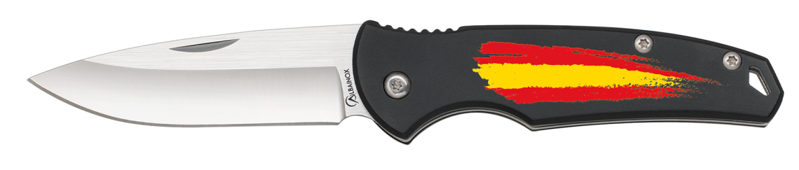 Navaja de bolsillo modelo bandera de España, hoja de acero inox, mango de aluminio, tamaño de hoja 7,20 cm.