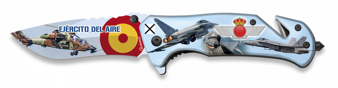 Navaja serigrafiada Ejército del Aire con mango de aluminio, muelle con bloqueo lateral y hoja de acero inoxoidable de 8,2 cm de longitud.