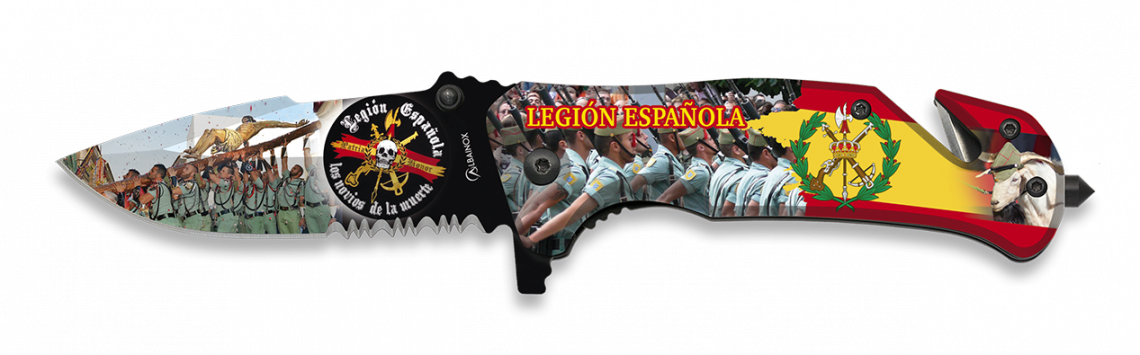 Navaja con serigrafía Legión española con mango de aluminio, muelle con bloqueo lateral y hoja de acero inoxidable, de 8,2 cm de longitud.