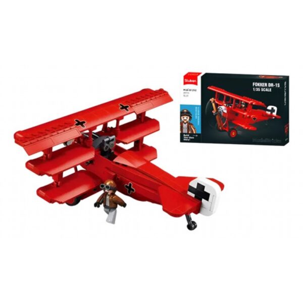El set Fokker DR-1S permite armar una detallada maqueta del famoso triplano utilizado en la Primera Guerra Mundial, conocido por ser el avión del legendario Barón Rojo.